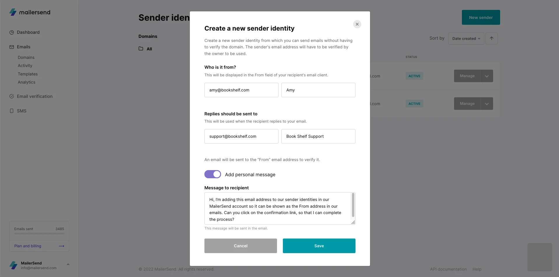 2. Next, you need to select the verified domain that you want to add the sender identity to. A dialog box will appear where you’ll be prompted to add the sender email address you want to verify, name of the person, reply-to address, reply-to name, and a personal note that will be sent to the owner of the email address.