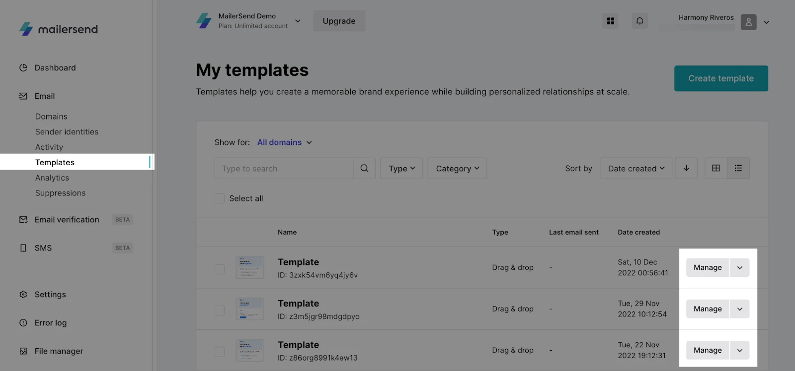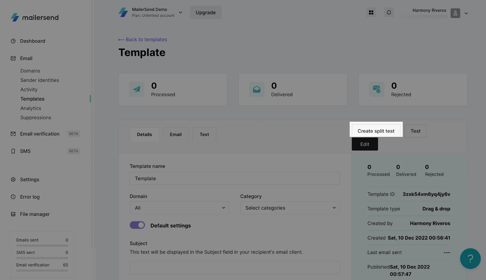 8. Once a template has been edited, it will appear on the Split test page. You can create up to 5 versions for the same template-id.