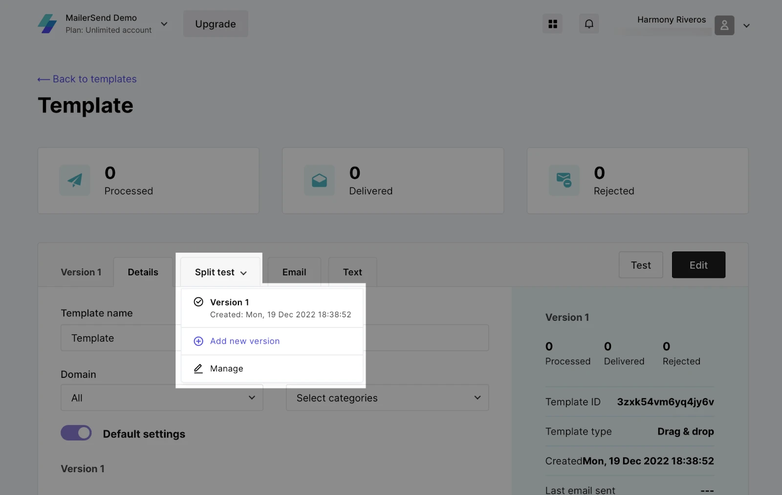 5. The original template will become Version 1. To create more versions, click the Split test tab and choose the option + add new version.