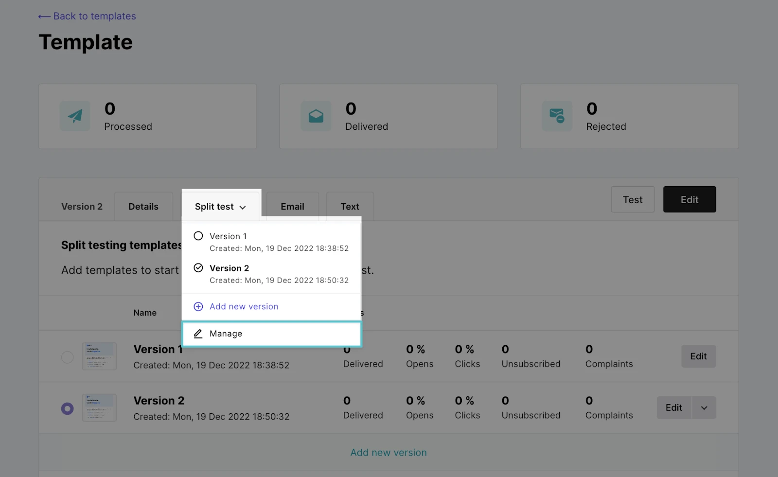 9. After each version has been created, navigate to the Split test page and click Manage.