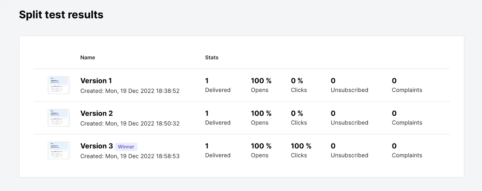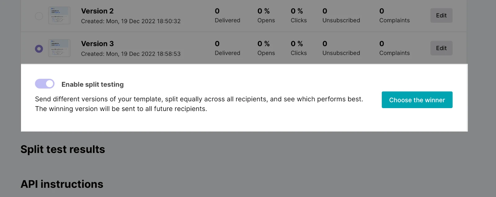 The various versions of your template will be shown equally across all recipients, and metrics for each version are recorded so you can see which performs best. When you select a winner, this unique version will be sent to all recipients.