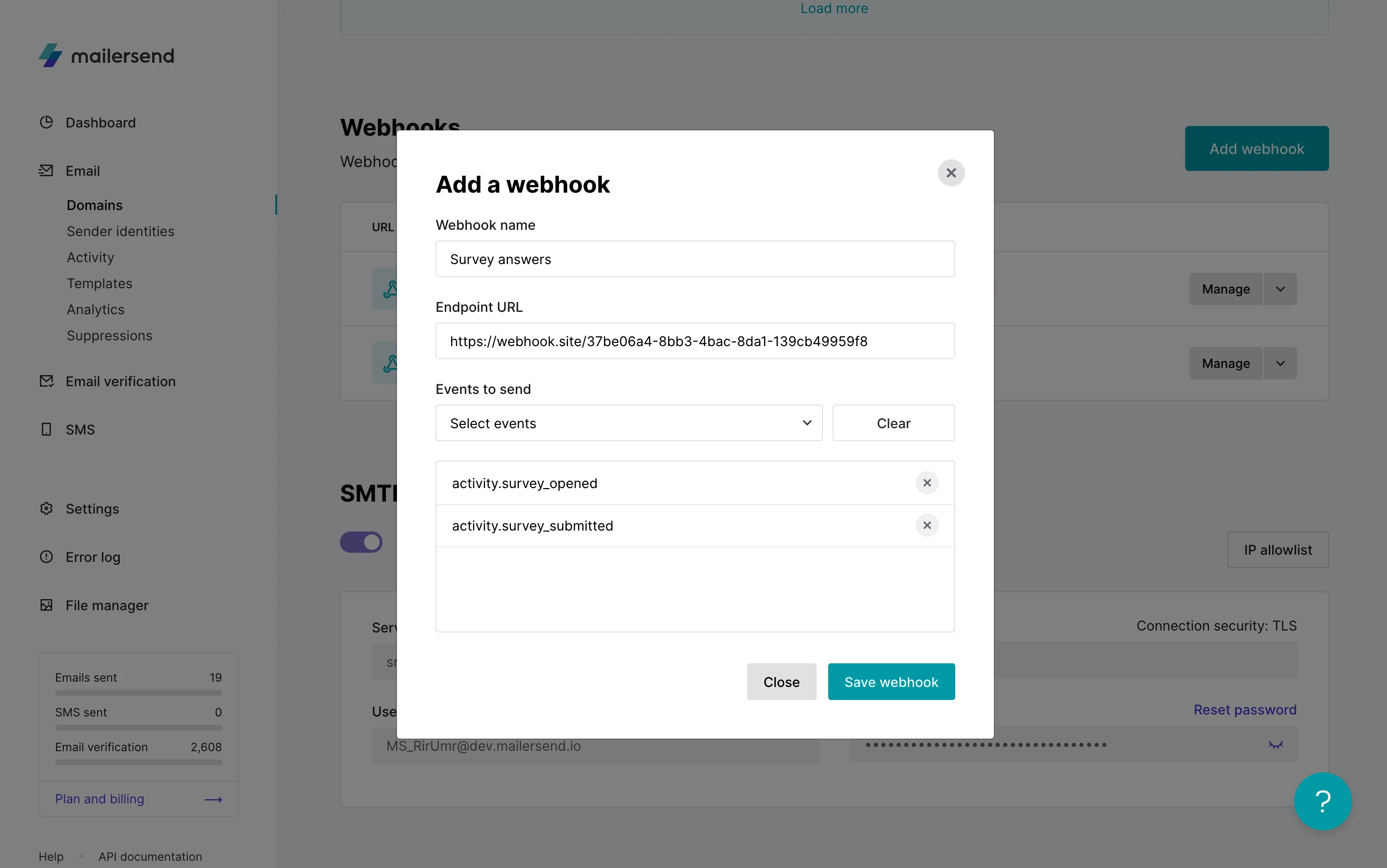 Add a Name, Endpoint URL, and add the events activity.survey_opened and activity.survey_submitted.