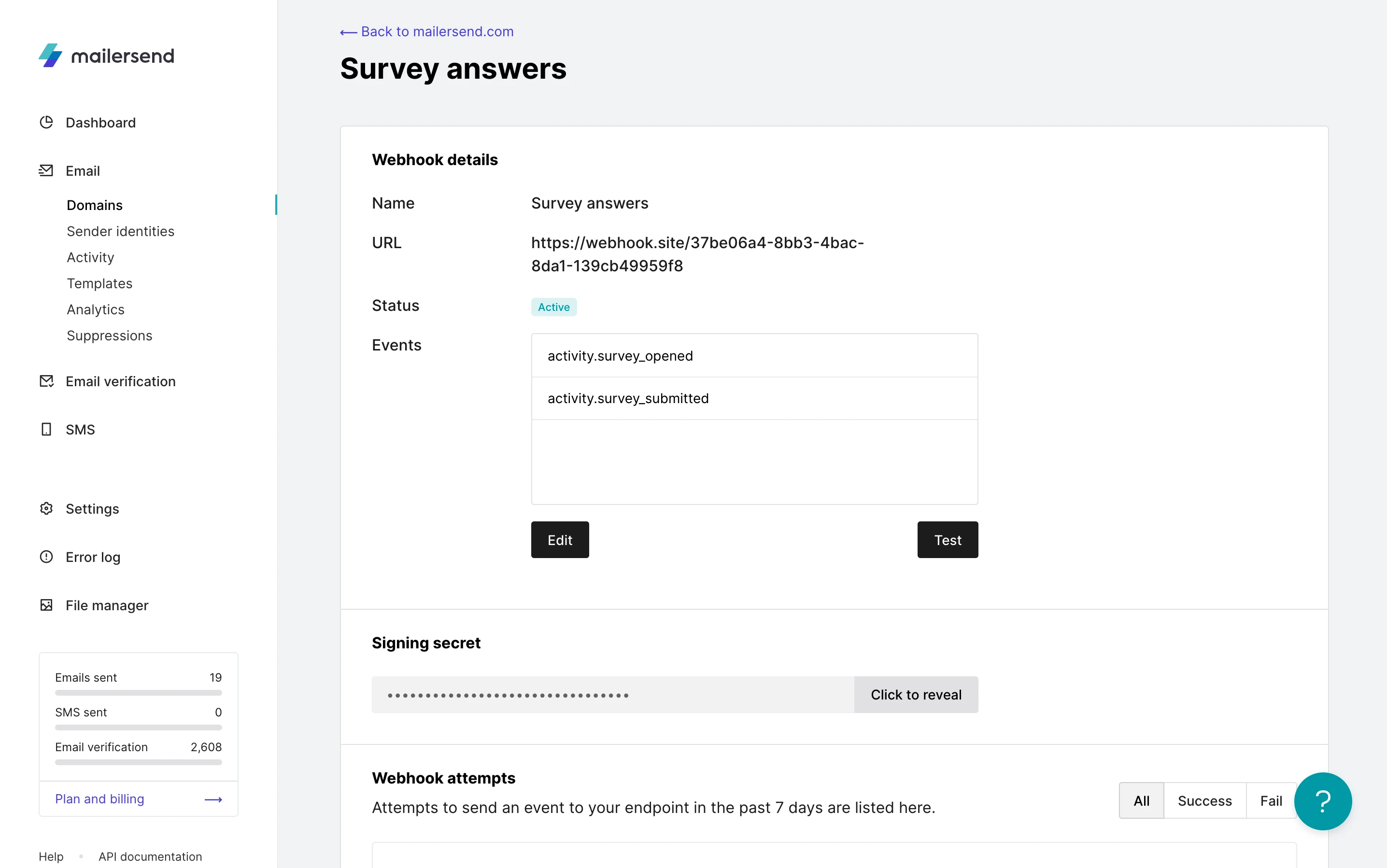 To receive the answers from your survey, you have to create a webhook on the domain of the API token you’ll send it with. To do this: