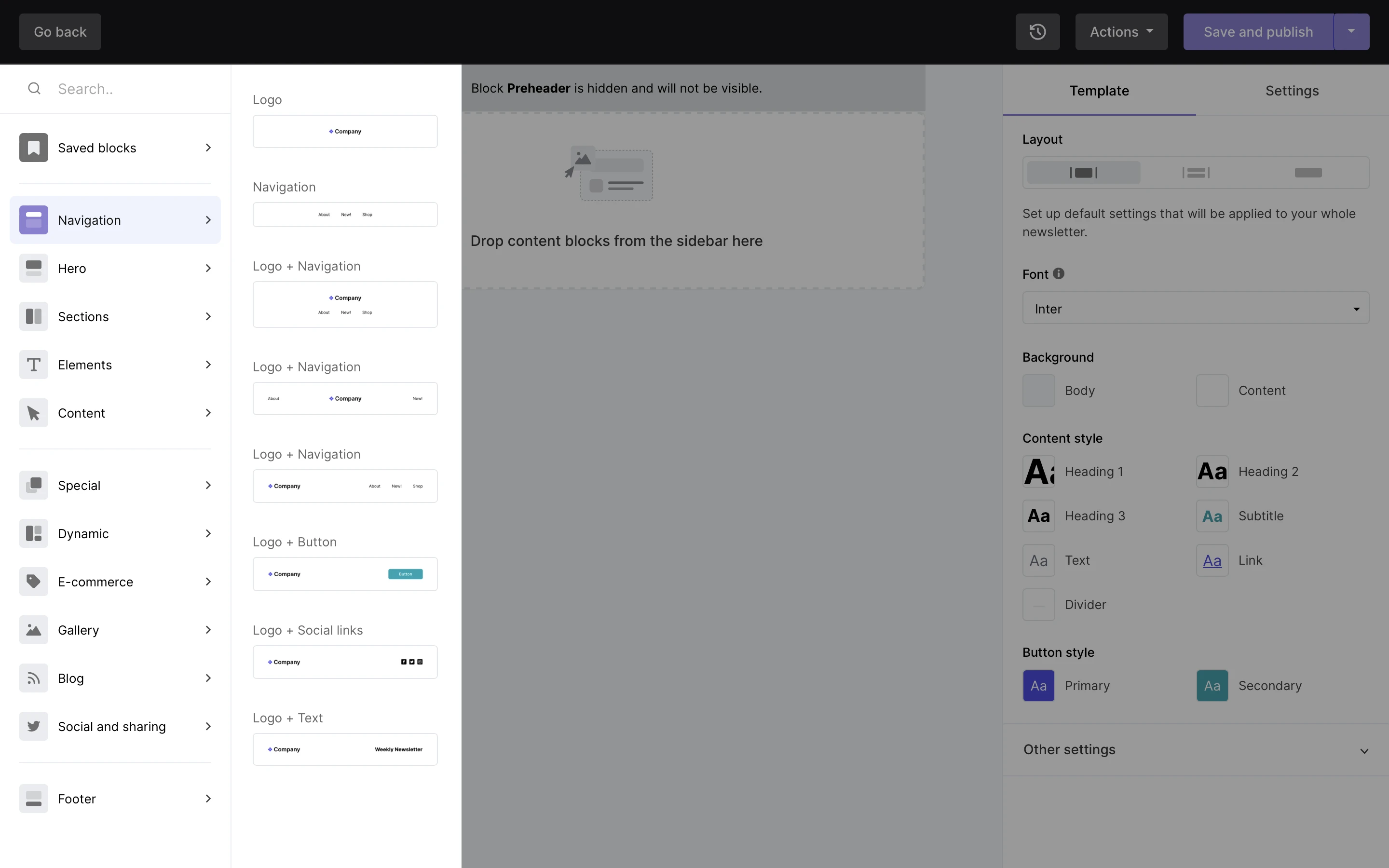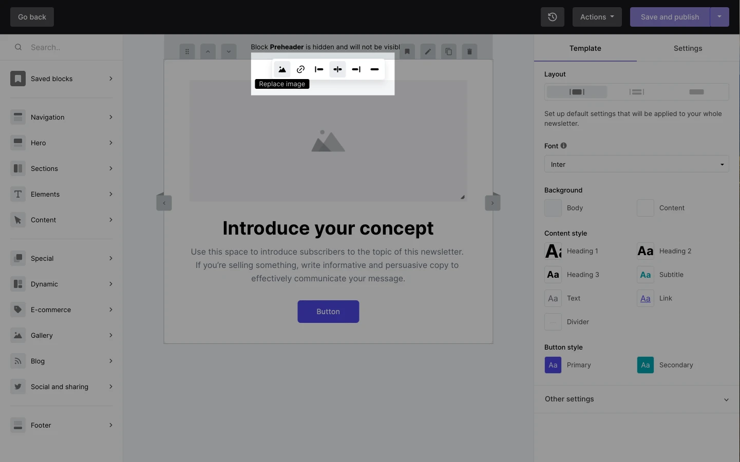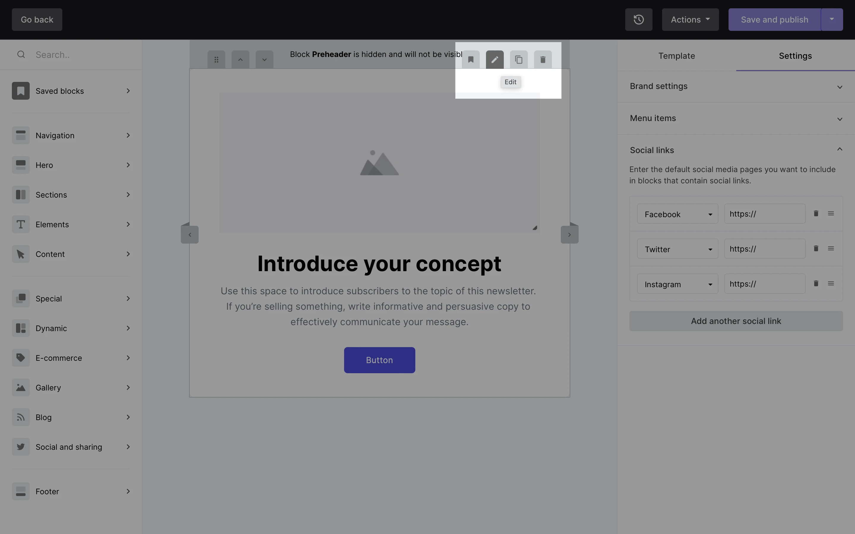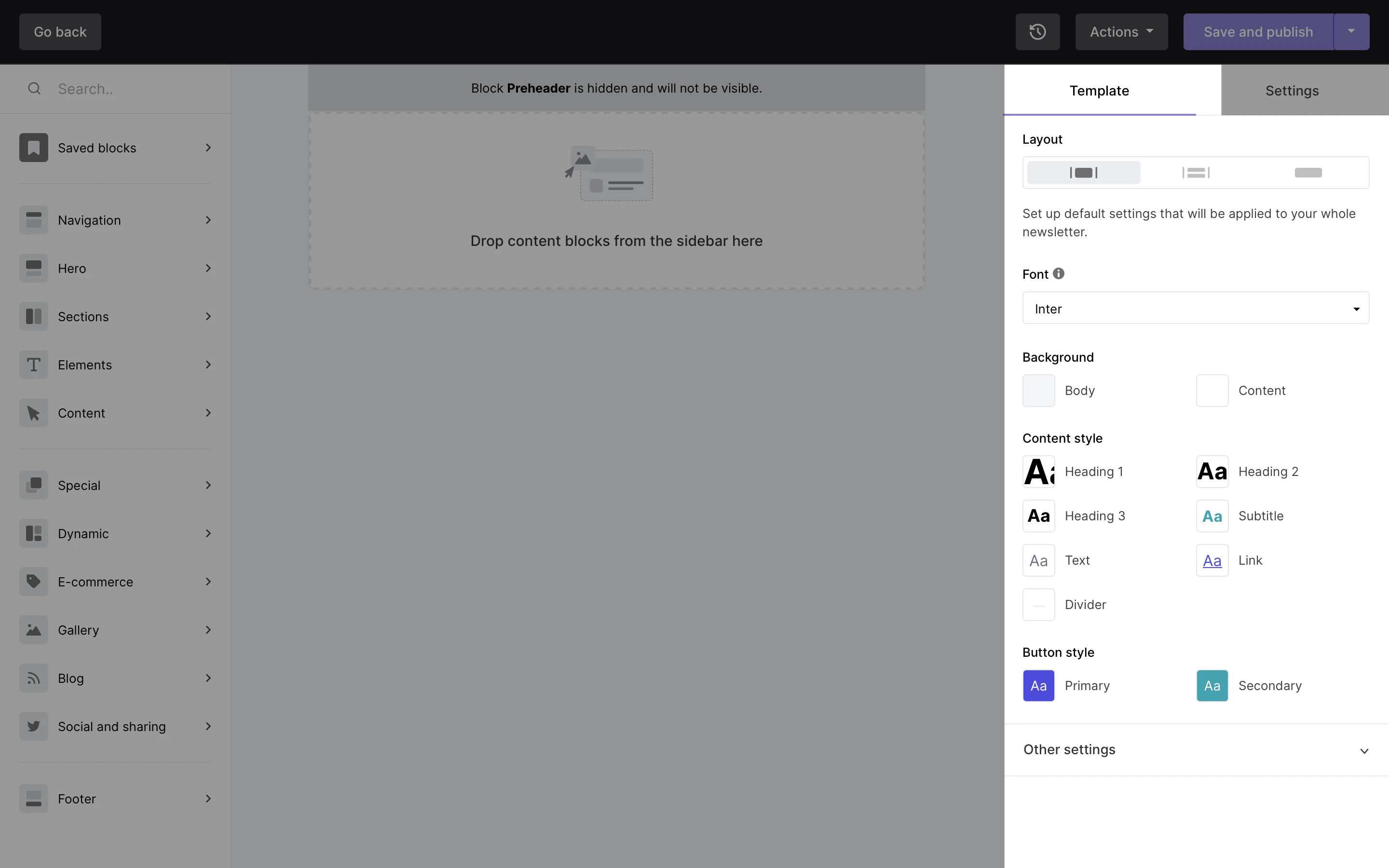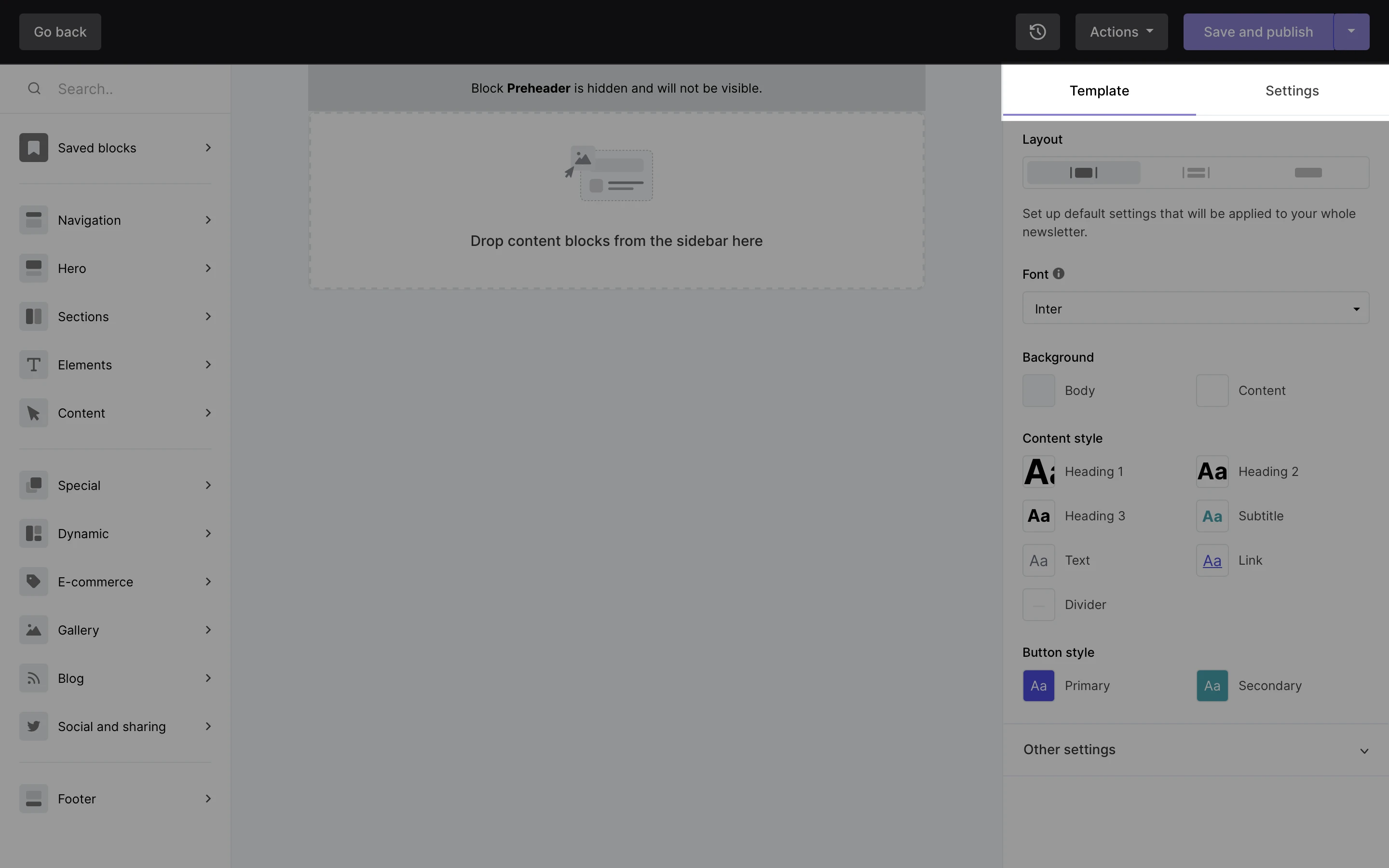 In the sidebar you will see two tabs: Template and Settings. Here, you can edit the general settings for the entire newsletter or each specific block when selected.