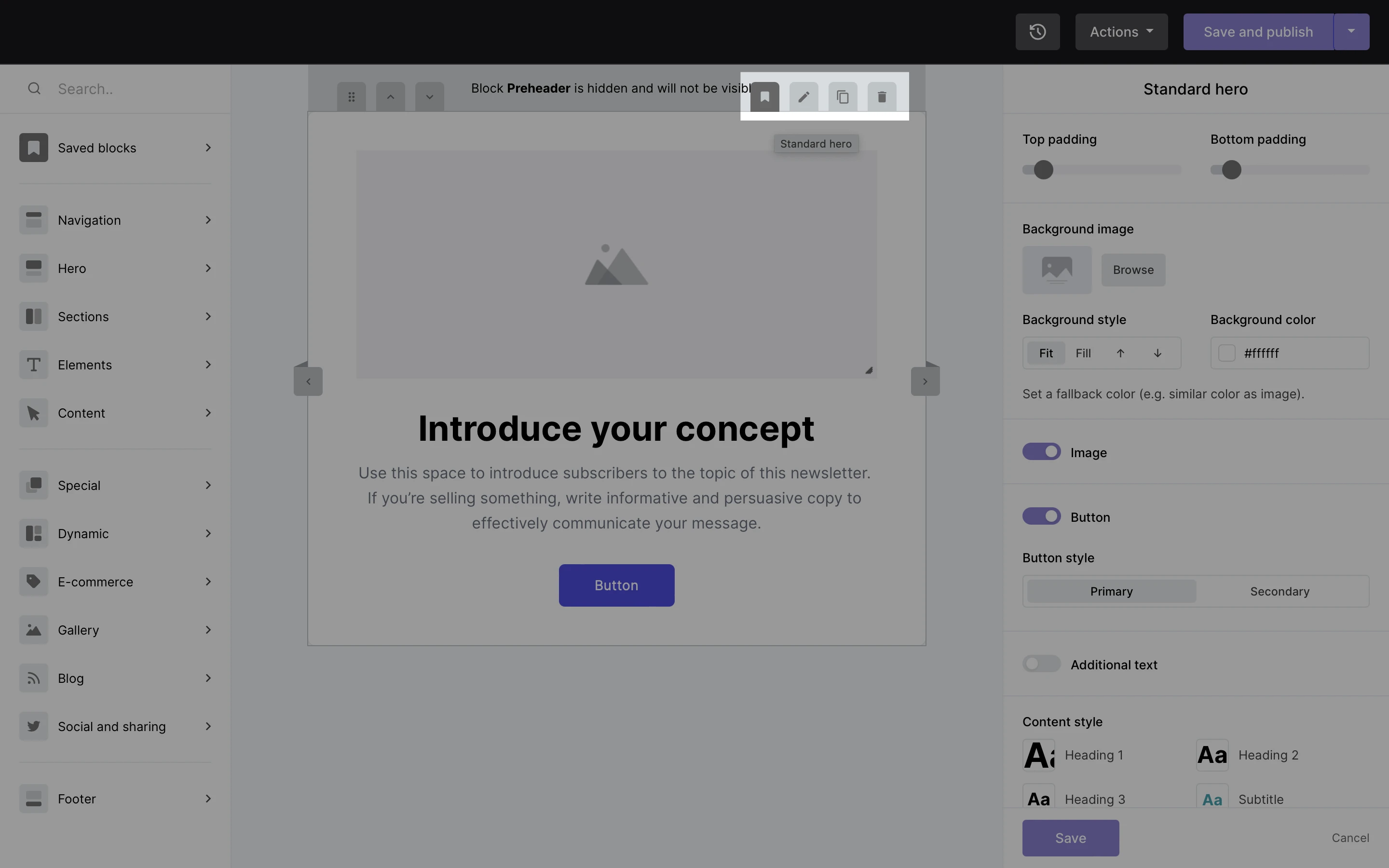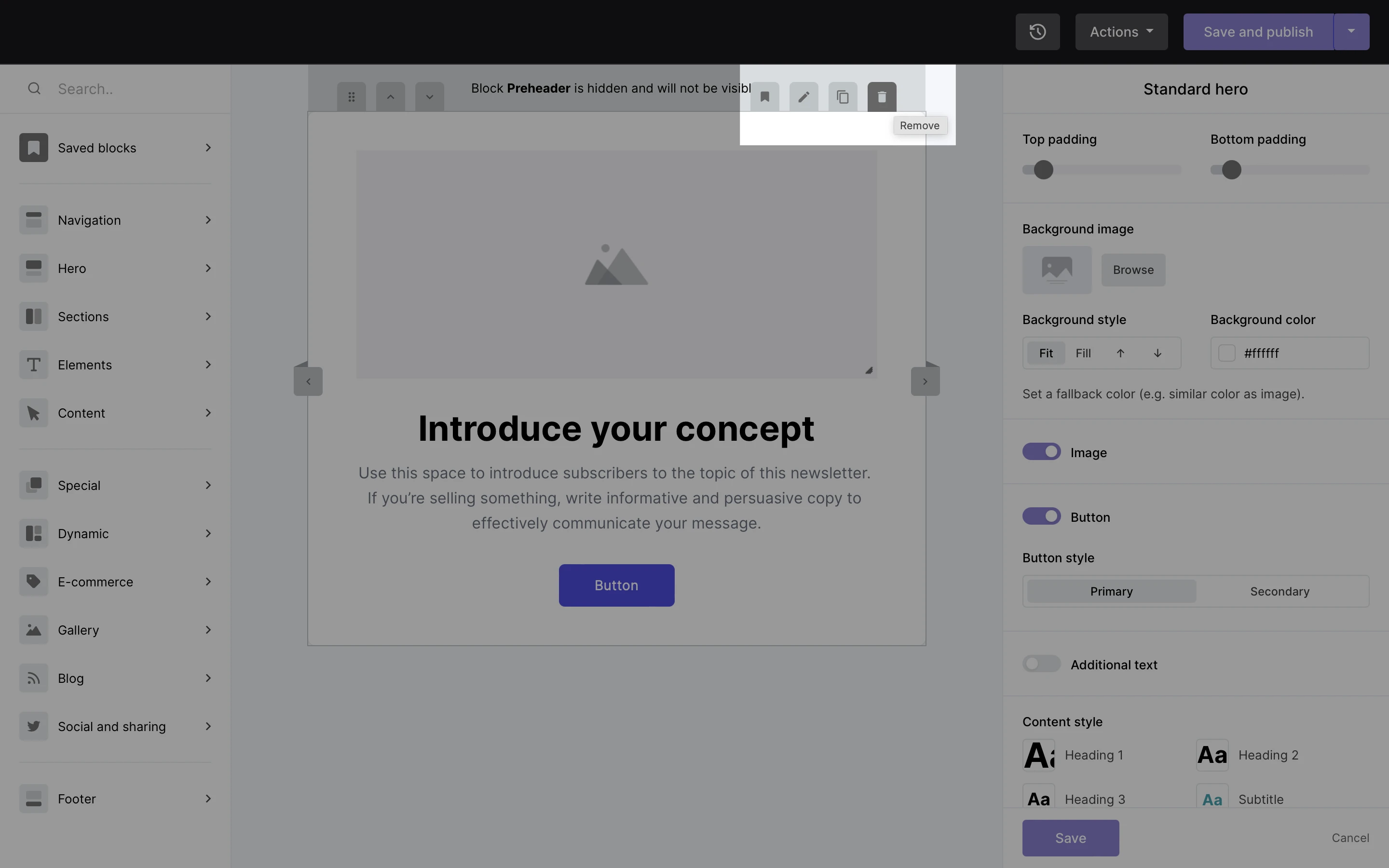 Hover over a block and click on the trash icon to remove it from your newsletter.