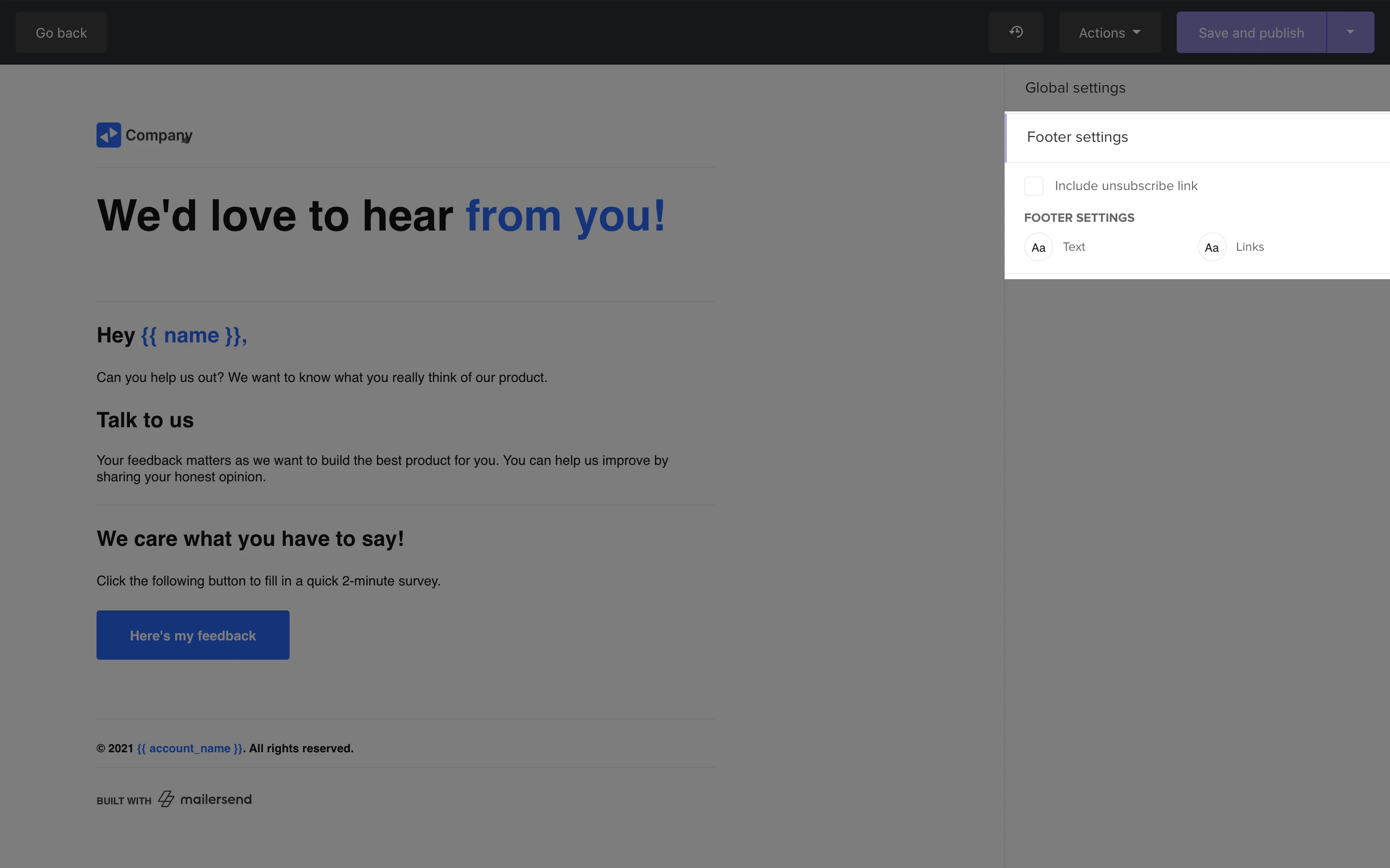 If you wish to display a logo, additional company information or any disclaimers in your email template, the footer is the place to do it.