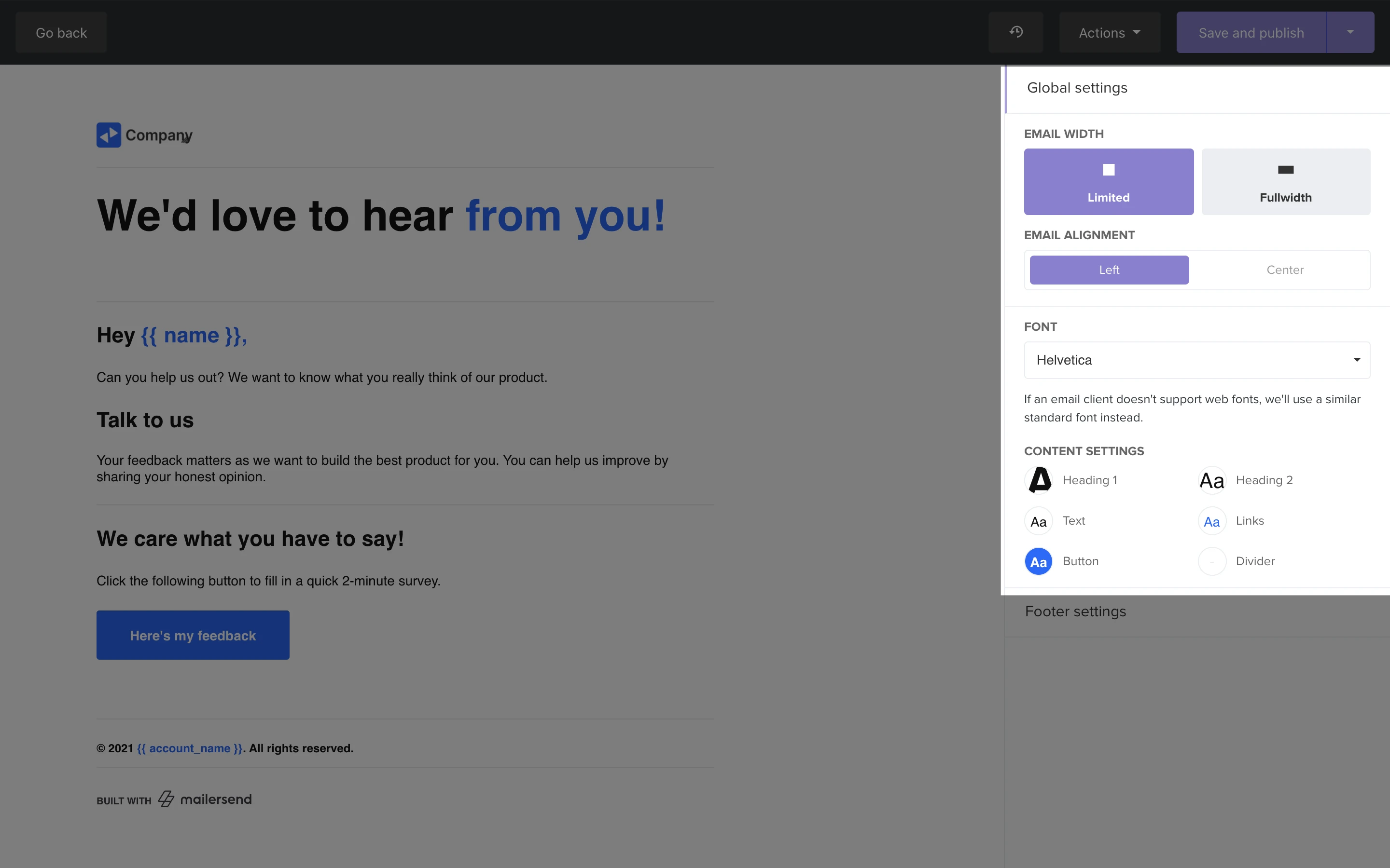There are 4 elements in your global settings: Email width, Email alignment, Font and Content settings.