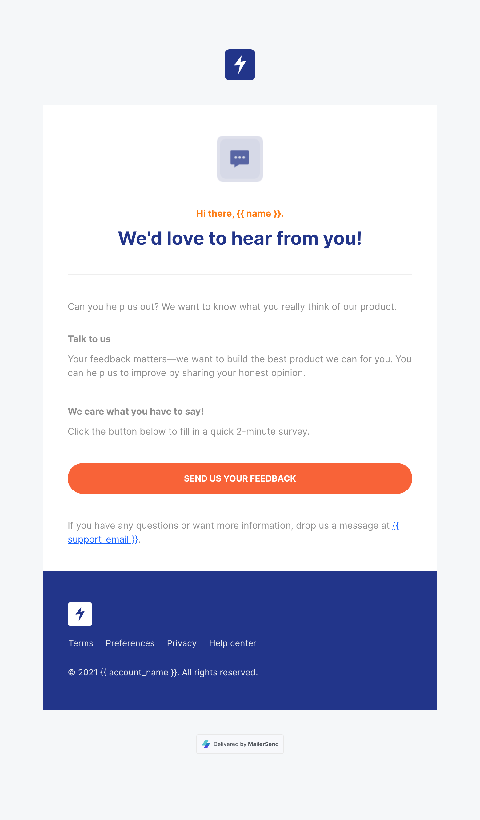 VhtLtd's customer feedback email template is the perfect tool to gather valuable feedback from your customers. With its customizable content and design options, you can easily tailor the template to match your brand's unique style. Our visual editor makes it a breeze to create a visually appealing email that will engage your customers and encourage them to share their thoughts and opinions. Gain valuable insights and improve your business with this user-friendly template.