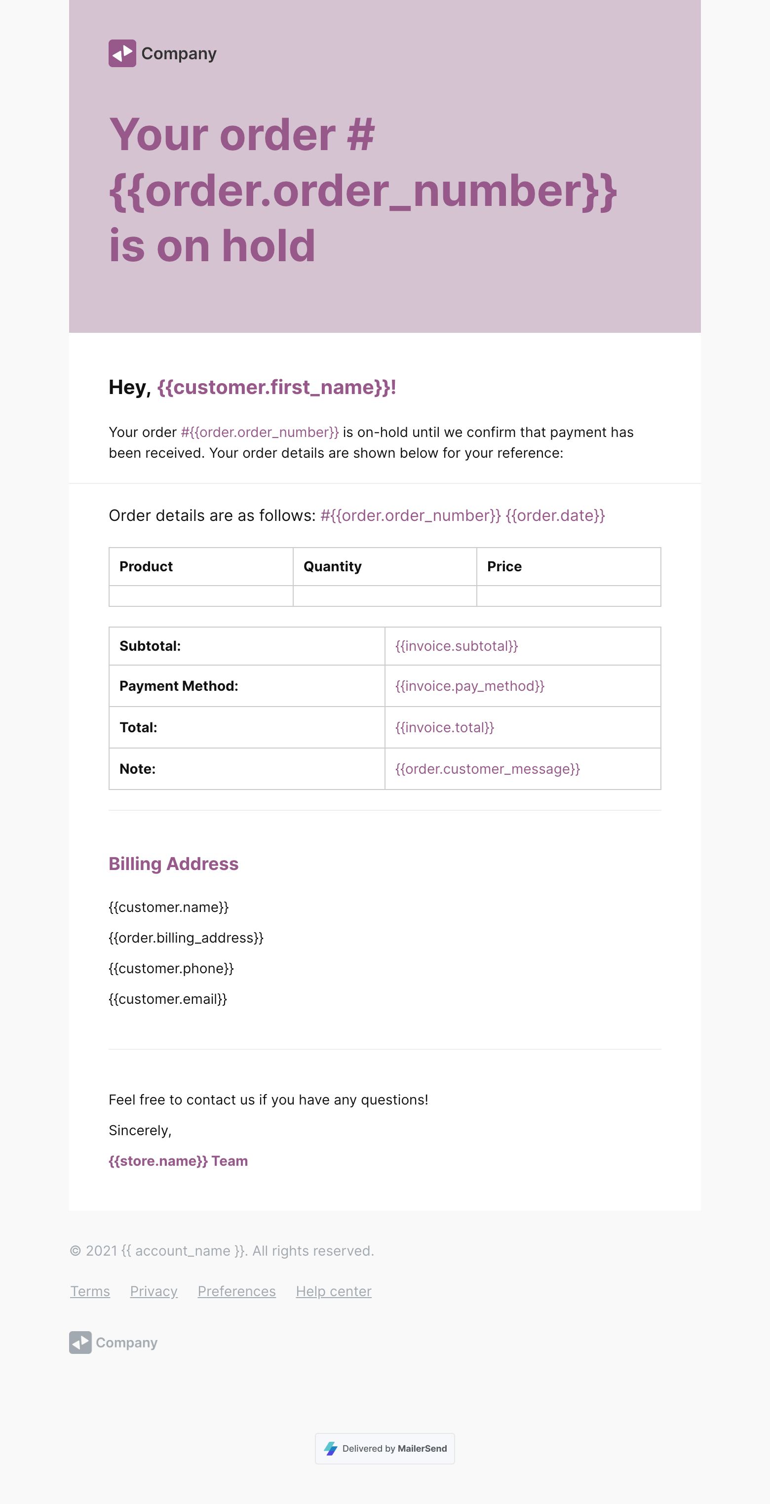 Stay connected with your customers and provide them with timely updates about their orders using VhtLtd's WooCommerce order on hold email template. With our user-friendly visual builder, you can easily customize the template to match your brand's unique style and tone. Keep your customers informed and engaged by sending them professional and visually appealing emails.