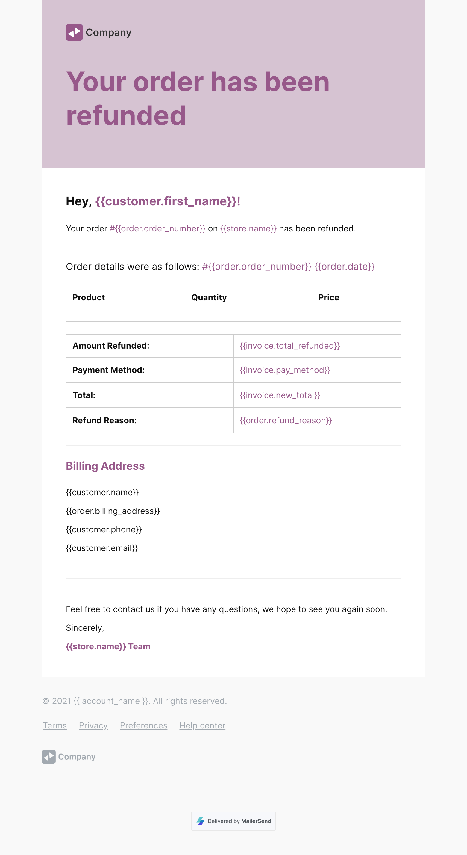 Stay connected with your customers and provide them with timely updates on their refund status using VhtLtd's WooCommerce order refunded email template. With our user-friendly visual builder, you can effortlessly customize the template to align with your brand's identity. Experience the convenience and efficiency of this unique email template - give it a try!