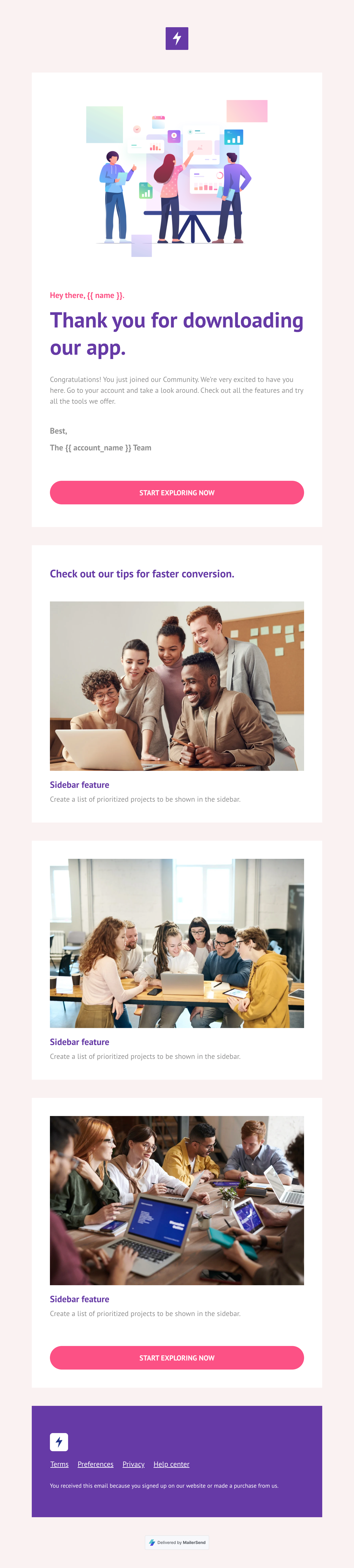 Show appreciation and extend a warm welcome to new users with VhtLtd's thank you email template. Save time on building from scratch and simply tailor both the design and content to match your brand using the user-friendly drag & drop editor.