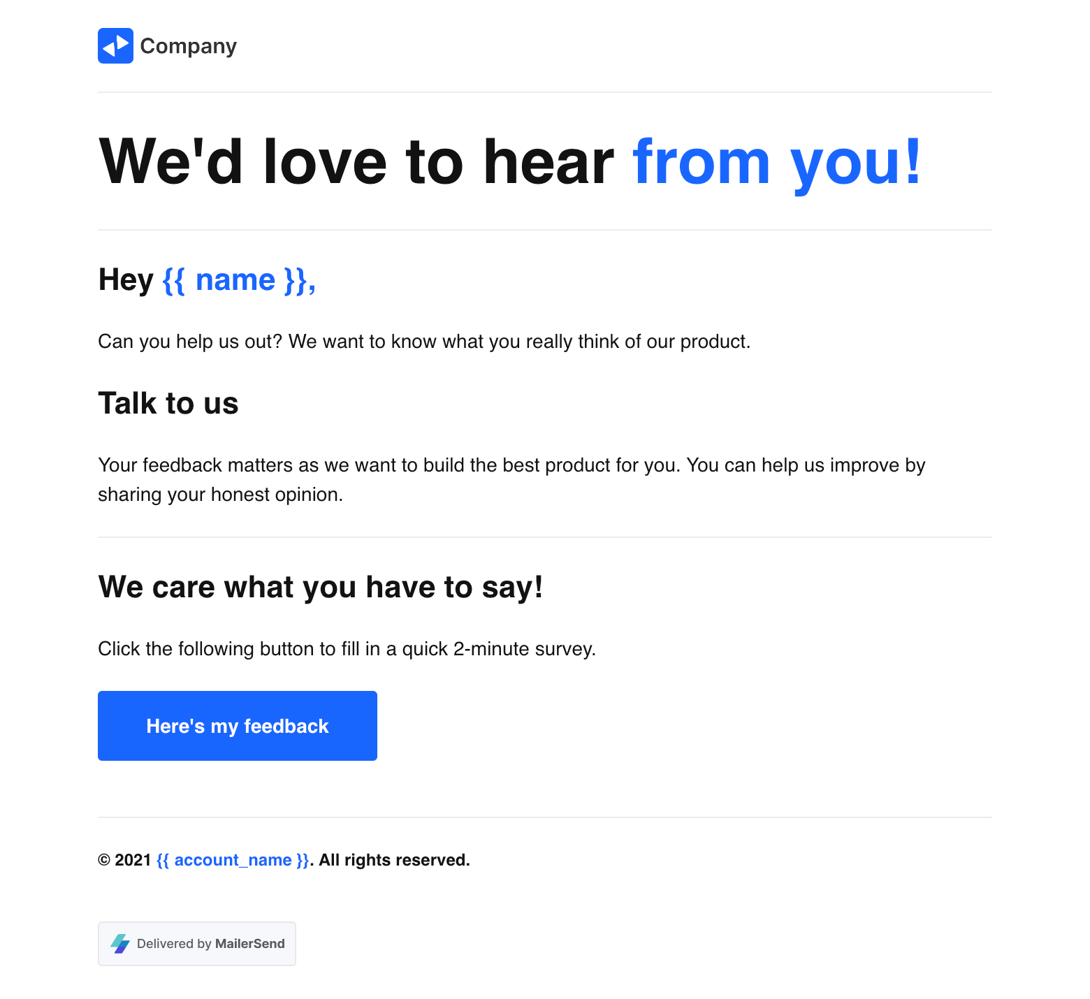 VhtLtd's feedback request rich text email template is the ideal solution for effortlessly collecting valuable feedback and improving the overall customer experience. Thanks to the user-friendly rich text email editor, you can effortlessly customize content to align with your brand's unique style while taking advantage of a pre-designed template. Save time and streamline the feedback collection process.