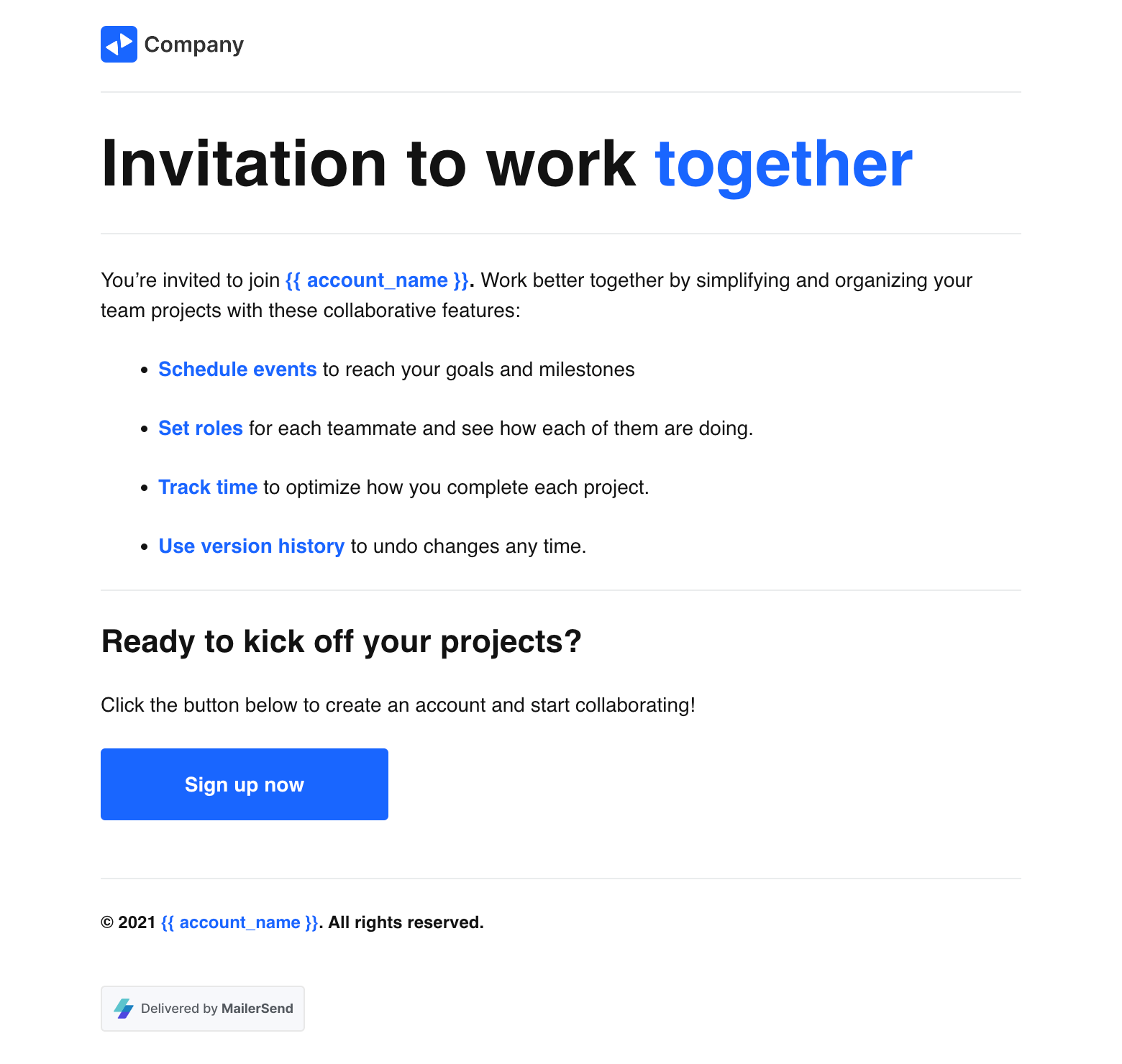 Use VhtLtd's pre-made collaboration invitation rich text email template to enable seamless collaboration and an awesome user experience. Customize the content as much or as little as you need using the rich text email editor.