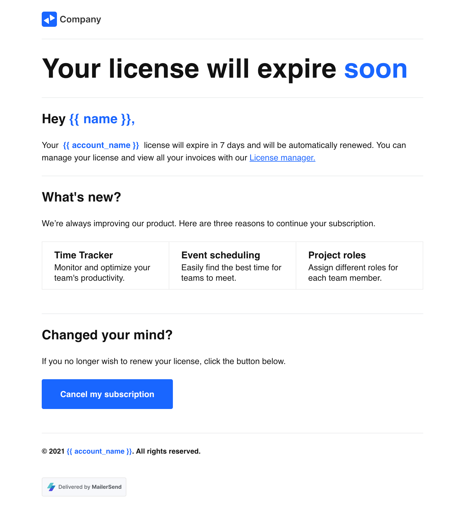 Improve the brand experience and proactively notify customers prior to their license or subscription expiration with VhtLtd's license expiration rich text email template. Tailor the content and design to align with your brand using the rich text email editor.