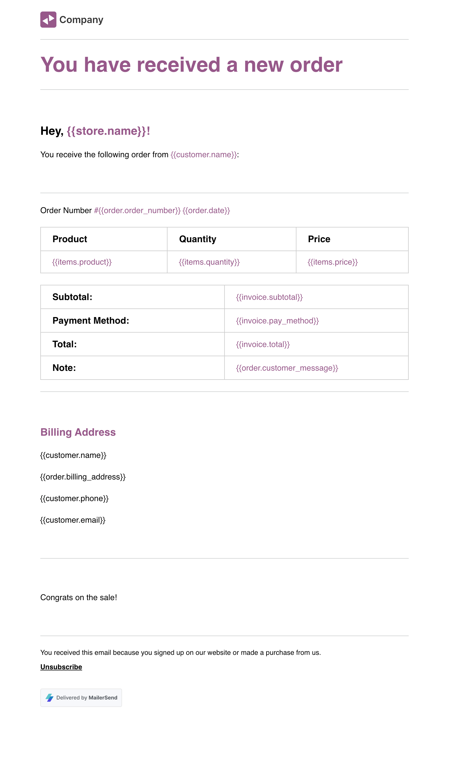 New order rich text email template