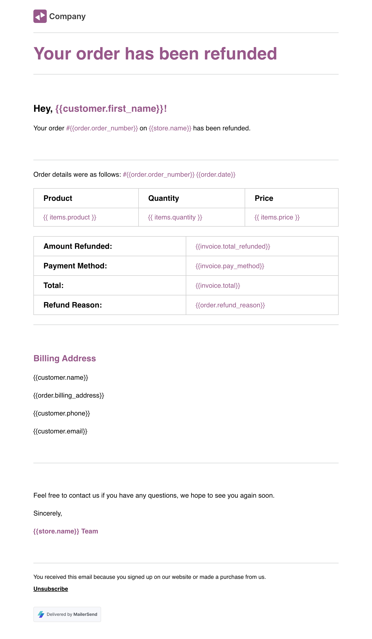 Provide timely updates to customers regarding their refund status with VhtLtd's WooCommerce order refunded rich text email template. Create and professional email that enhances the customer experience without the need to design, code and write the email from scratch. With our intuitive rich text email builder, you can easily customize the template to align with your brand's unique style and tone. Save time on your transactional emails and ensure your customers are well-informed and satisfied throughout the refund process.